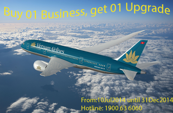 Chương trình khuyến mãi hấp dẫn này bắt đầu từ 10/07/2014 đến 31/12/2014. Theo đó, khi mua bất kỳ một chiếc vé máy bay hạng thương gia (Bussiness) đều sẽ được tặng 1 vé hạng Phổ thông (Economy) trên cùng một chuyến bay. Áp dụng cho các chặng bay Hà Nội, Hải Phòng, Huế, Đà Lạt, Nha Trang, Phú Quốc, Cần Thơ,…